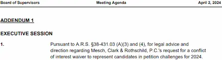 What a peculiar item to find on the agenda for this morning's BoS meeting, and on the addendum for Executive Session—closed to public viewing—no less: Asking the County Attorney if it's o